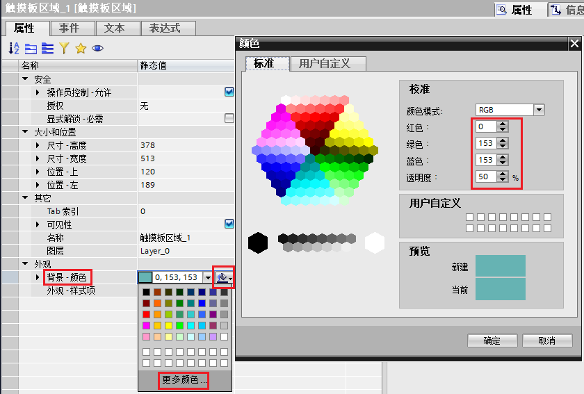 为了更好的显示“触摸板区域”效果,在其外观属性中设置“背景-颜色”为RGB(0,153,153),透明度为50%。