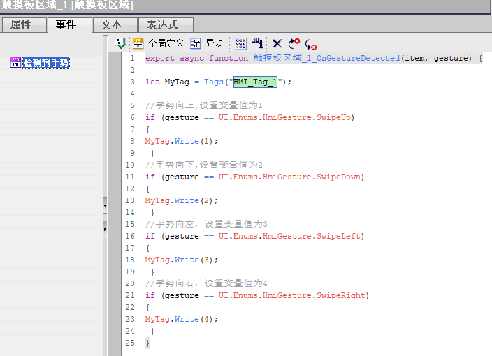 选择“触摸板区域”,在其“事件”选项卡下点击 JS 图标,编写相应的功能。