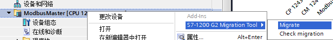 1. 项目树中选择 S7-1200 文件夹,鼠标右键,下拉菜单中点击“S7-1200 G2 Migration Tool”,下一级子菜单中选中“Migration”,如图8.所示。