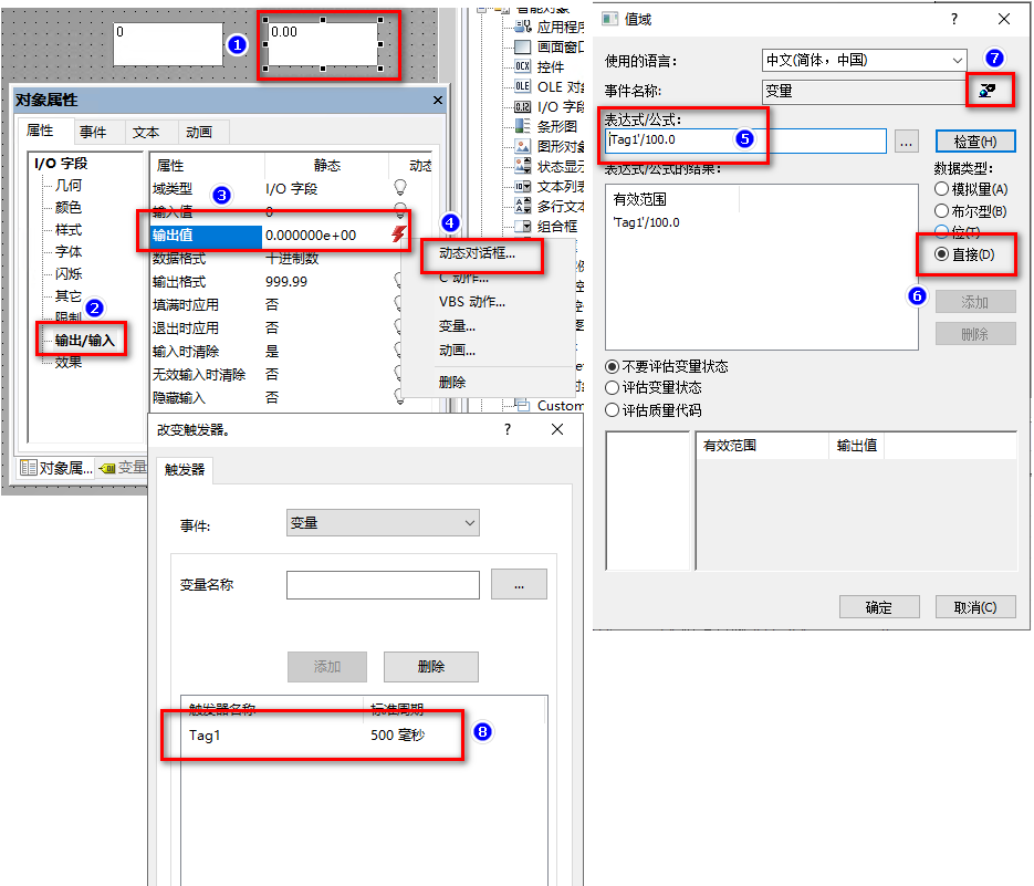 在I/O域的输出值属性处组态动态化,选择动态对话框。在动态对话框中的表达式/公式处添加Tag1变量填写表达式 Tag1/100.0(变量值除以100.0), 注意这里的100.0必须保留小数位。数据类型选择“直接”。另外还需调整变量的刷新周期,这里设置为500ms。