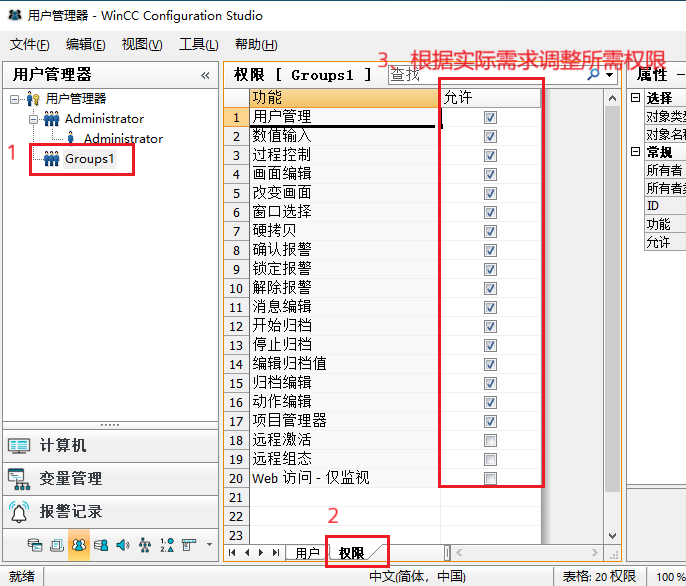 点击新建的组名,切换至“权限”表格界面,勾选需要的权限。