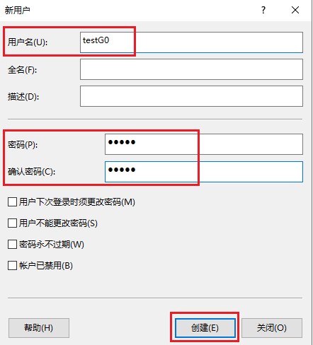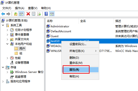 用户名称可自定义,设置密码后,点击“创建”即可,这里需要注意取消“用户下次登录时须更改密码”设置。然后点击创建的用户,右键选择 “属性”。