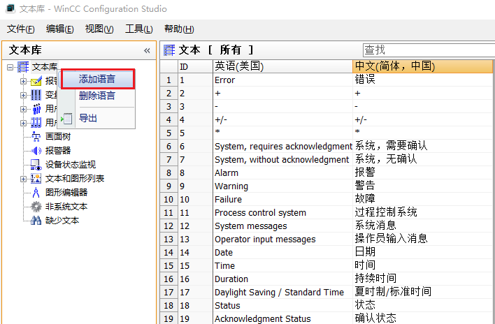 在文本库编辑窗口中,可以看到当前项目中已经存在的语言有 “中文(简体,中国)“、“英语(美国)“,如下图所示,需要添加 “德语(德国)“。