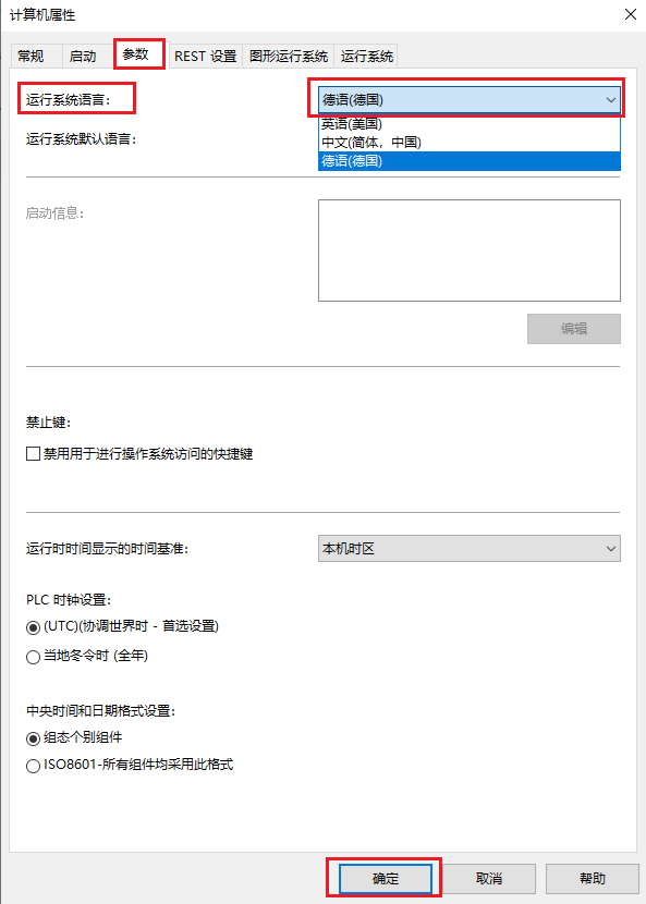 选择“参数”选项卡,在 “运行系统语言” 中选择 “德语(德国)”,设置完成后,点击“确定”