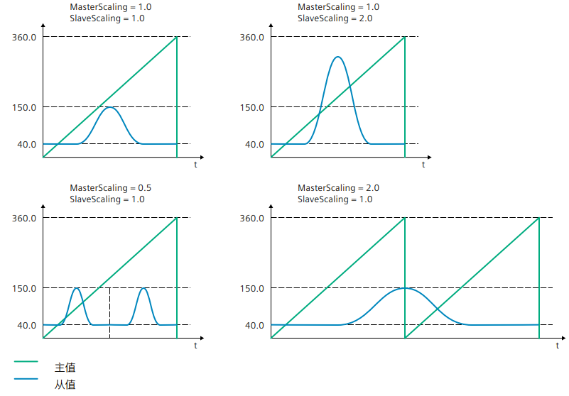 通过“MasterScaling”和“SlaveScaling”参数可以对电子凸轮引导值及跟随值进行比例缩放,示例如图4所示。