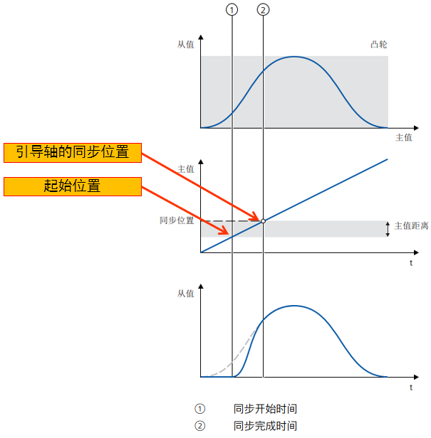 ③ “MasterSyncPosition”:相对于凸轮起始位置的引导轴的同步位置。