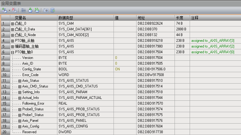 轴变量为系统定义的变量,由轴参数、当前位置和错误信息等监视信息组成。通过 STEP7-Micro/WIN SMART V3 创建轴时,轴变量按照创建的顺序注册在全局变量表中。