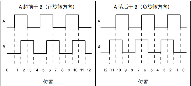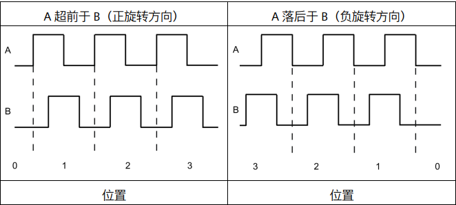 一个输出 (A) 的输出脉冲对应正向,另一个输出 (B) 的输出脉冲对应负向。 如图2.3所示