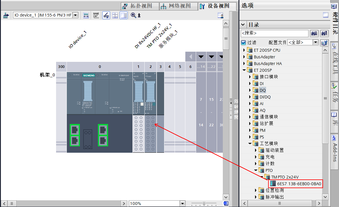 (1)将 TM PTO 2 工艺模块添加到 ET200SP 子站相应插槽上,如图3.1所示。