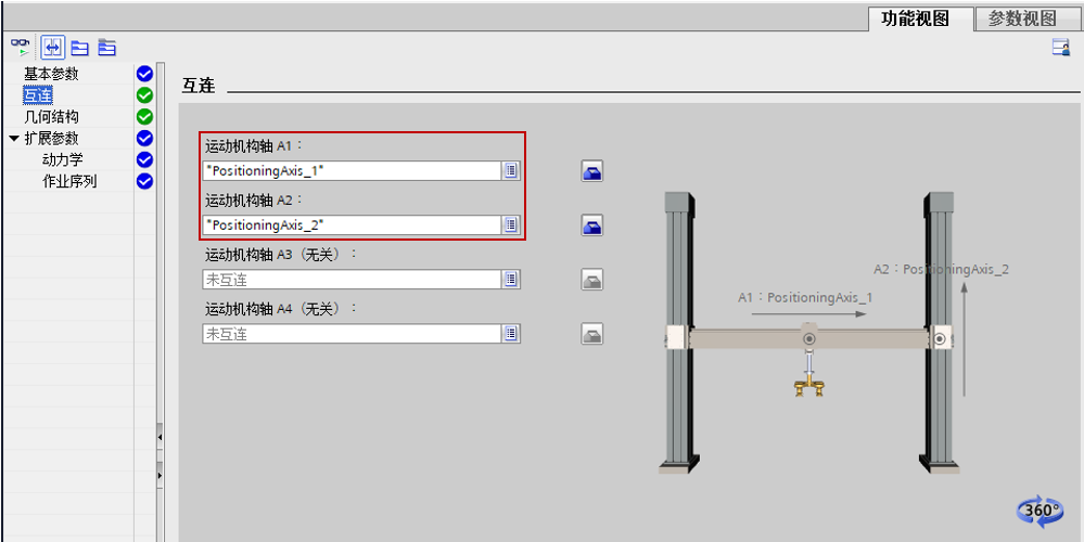 工艺对象“PositioningAxis_2”关联运动机构轴 A2,执行垂直方向的运行。