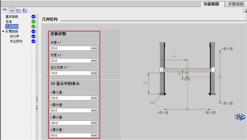 (5)在“几何结构”中设置运动机构的变换参数以及 3D 显示的范围。