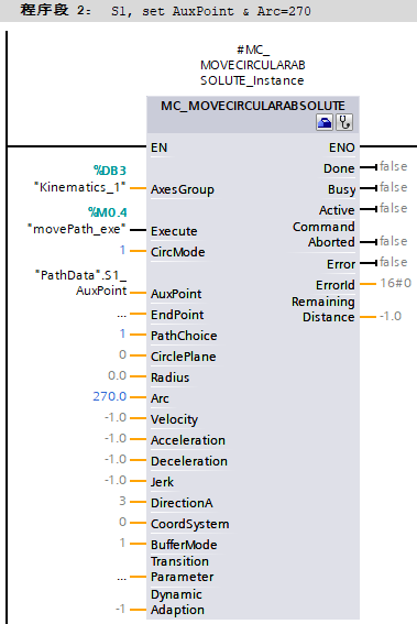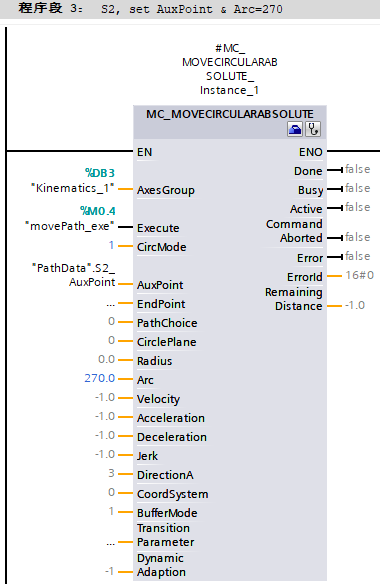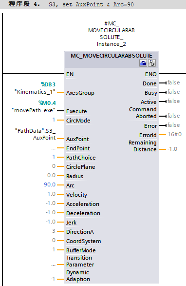 “CircMode”=1:通过圆心和主平面中的角度从当前位置画圆弧,圆心由“Pathdata.S3_AuxPoint”参数指定,圆周运动的角度“Arc”=90,圆周轨迹的终点通过圆心和角度进行计算