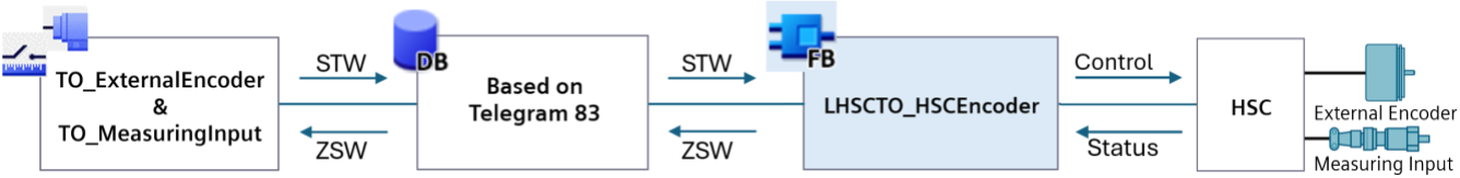 1)程序块“LHSCTO_HSCEncoder”[FB3] 建立 HSC 与编码器数据块 DB1 之间的连接,将 HSC 的状态包括计数值按照标准报文 83 的结构传递到编码器数据块 DB1 中由外部编码器工艺对象和测量输入工艺对象使用。同时将这两个工艺对象对编码器的控制字从编码器数据块 DB1 传递给 HSC,如图10所示。