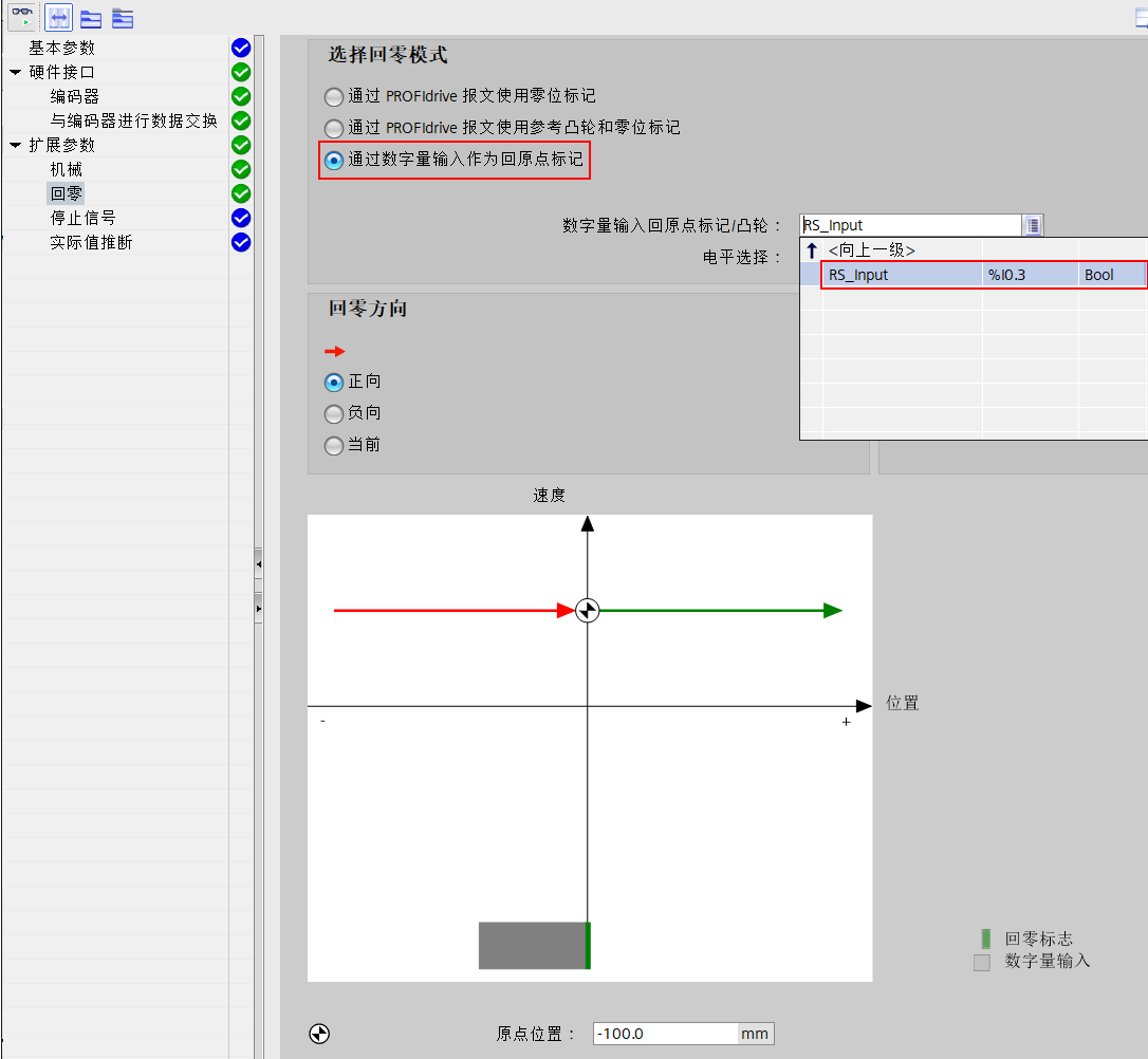 (3)外部编码器工艺对象可以被动回零。本示例中选择回零模式为“通过数字量输入作为回原点标记”,数字量输入选择 CPU 上板载的输入通道 3,地址 I0.3。回零完成后,设置当前位置为 -100.0mm,如图17所示。