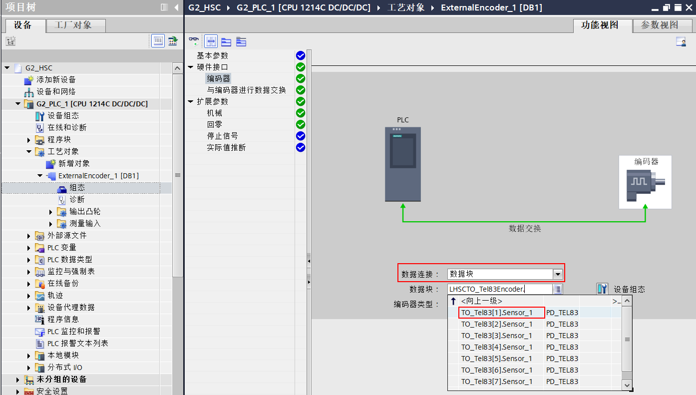 (1)创建外部编码器工艺对象,在组态界面,选择数据连接为“数据块”,连接到“LHSCTO_Tel83Encoder”[DB1] 数组的第一个元素,如图15所示。
