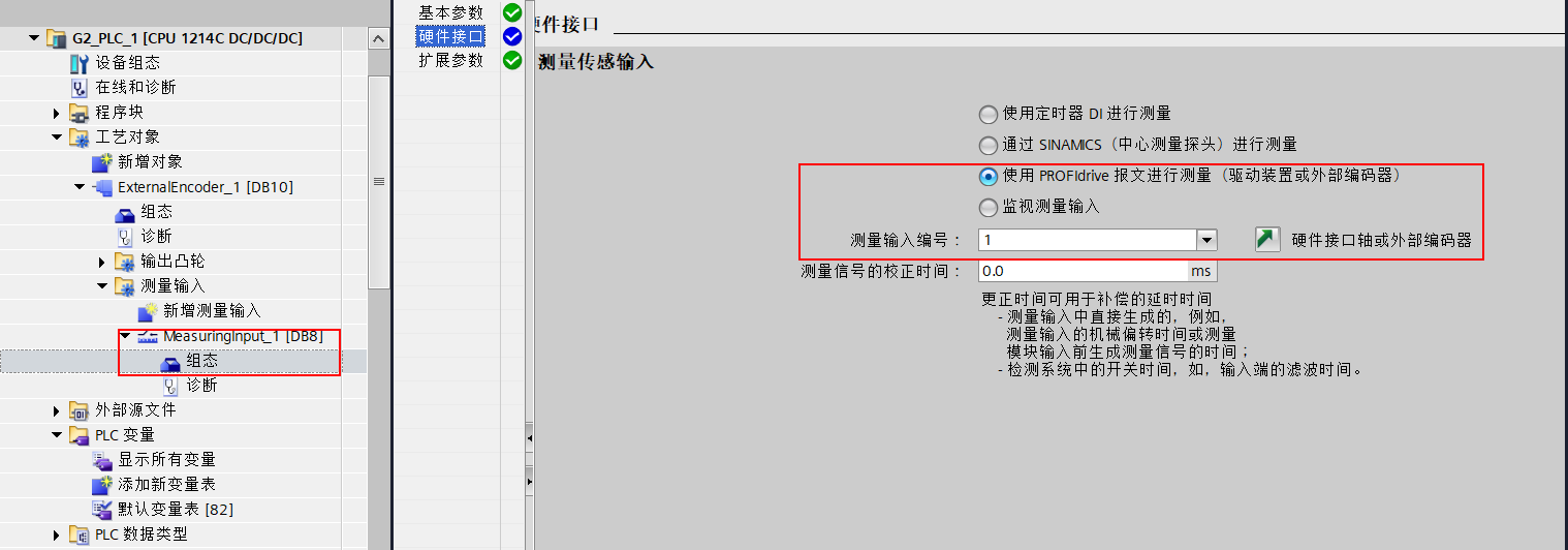 (4)新增测量输入工艺对象,HSC1 启用了“捕捉输入”功能,将测量输入开关接到 CPU 板载的输入通道 2,地址 I0.2。当测量开关接通时可以输出一个实际位置值。在硬件接口中选择测量输入类型“使用 PROFIdrive 报文进行测量(驱动装置或外部编码器)”,选择测量输入编号“1”,如图18所示。