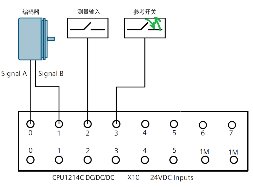 (1)使用 CPU 的板载高速输入连接一个 24V 增量编码器,同时连接外部开关作为测量输入和回零的参考开关,示例中接入 Ia.0 到 Ia.3,如图2所示。
