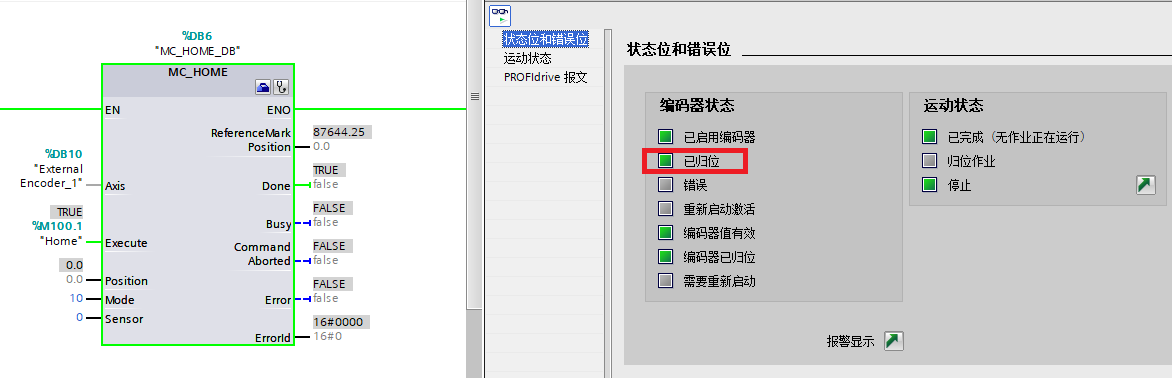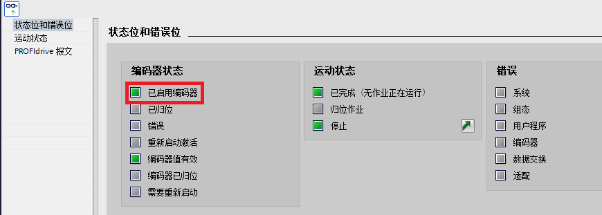 可以在在轴的诊断编辑器中监测编码器的状态位和错误位以及运动状态。