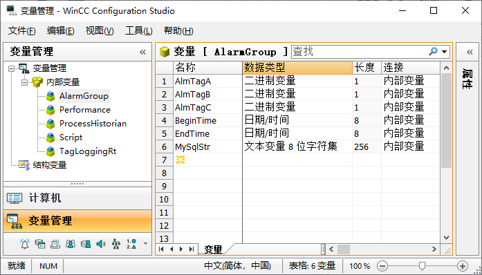 其中AlmTagA、AlmTagB和AlmTagC用于组态报警,MySqlStr用于动态化查询条件,BeginTime和EndTime 用于设定查询条件中的时间范围。如下图所示: