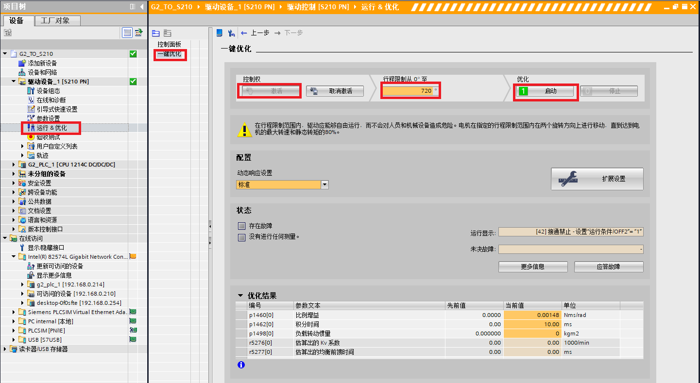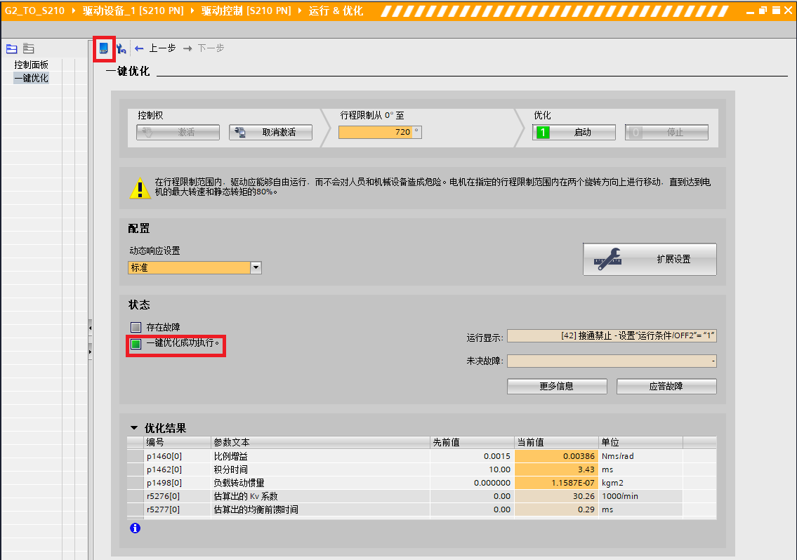 1)下载后,将 S210 转至在线,双击“运行&优化”进入“一键优化”。点击“激活”获取控制权后,输入优化时的行程限制范围,例如“720°”,然后点击“启动”开始一键优化,如图2.29所示。