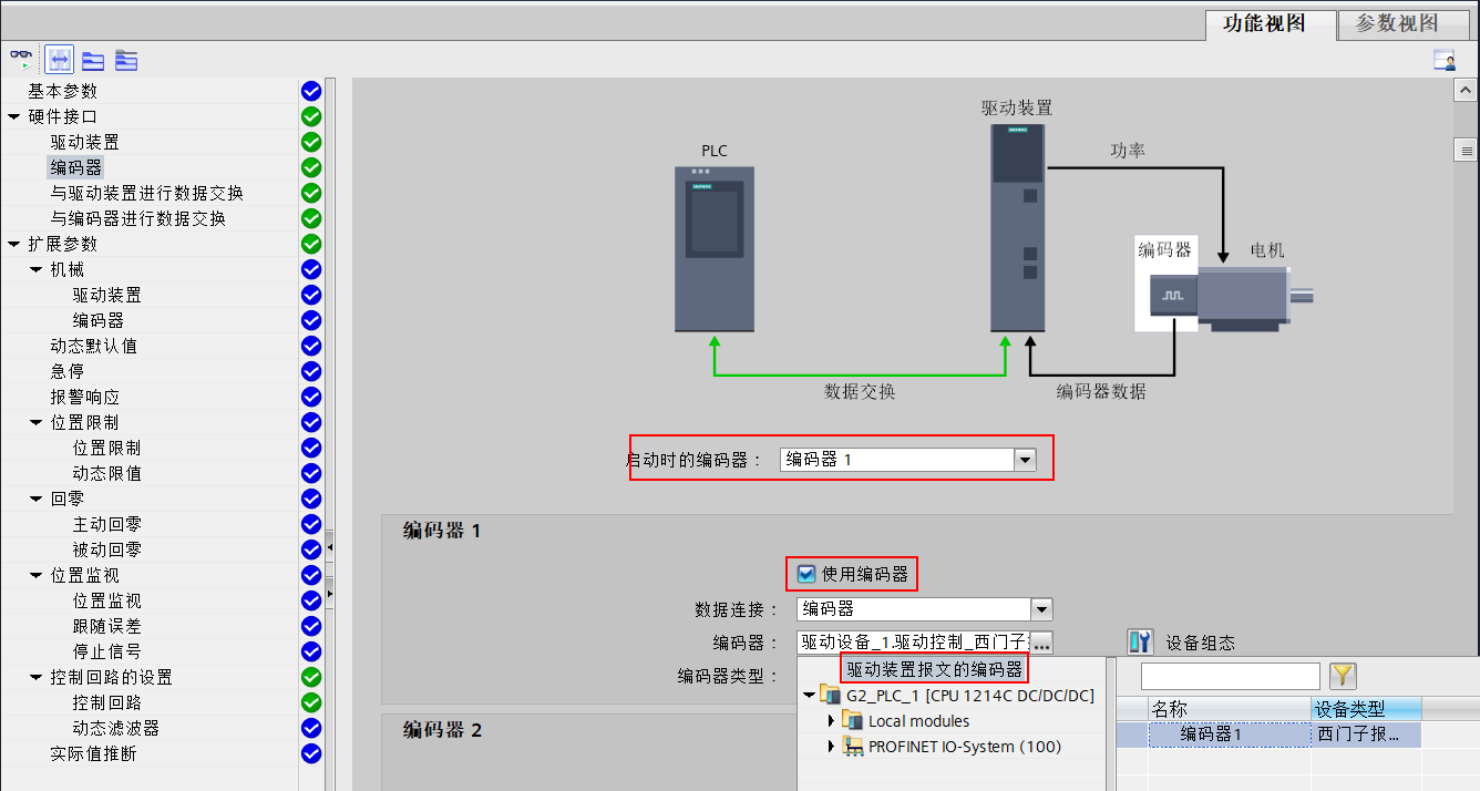 (5)配置编码器参数,选择“启动时的编码器”为“编码器 1”。在“编码器1”处勾选“使用编码器”,“编码器”选择框的列表中选择“驱动装置报文的编码器”(采用 S210 提供的标准报文 105 中的编码器值)。编码器 2-4 不使用,如图2.37所示。