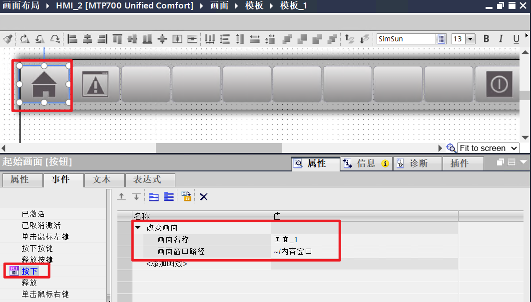 - 组态“模板_1”的尺寸及按钮事件