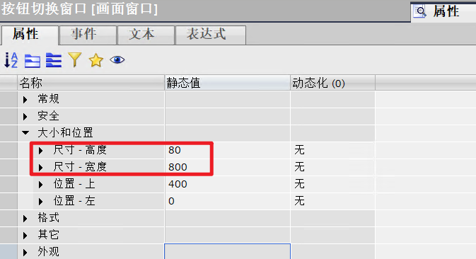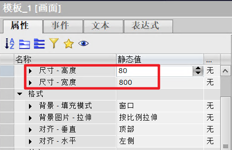 - 设置“按钮切换窗口”的尺寸为800x80,画面对象为“模板_1”。