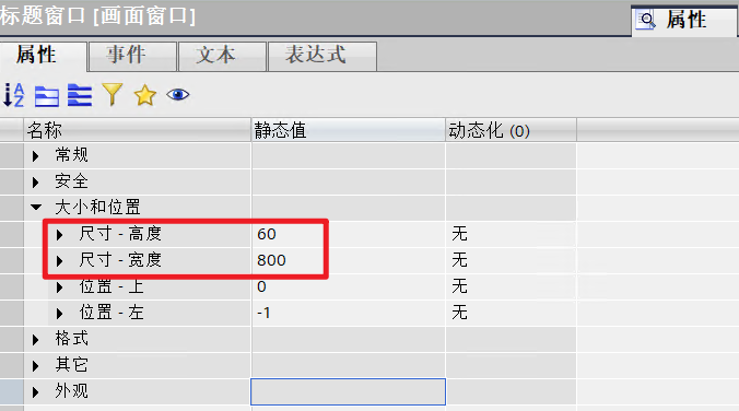 - 设置“标题窗口”的尺寸为800x60,画面对象为“模板_2”。
