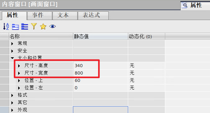 - 设置“内容窗口”的尺寸为800x340,画面对象为“画面_1”。