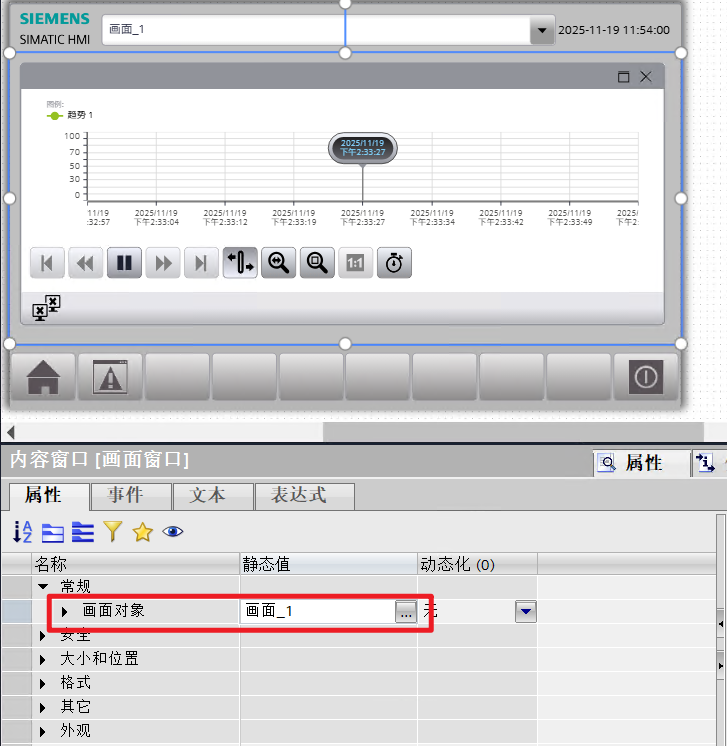 - 组态“画面_1”的尺寸及内容