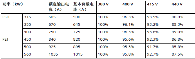 加粗表示的额定输出电流值指电源输入为 400 V 且环境温度为 40 °C 时默认脉冲频率下的电流值。要计算 380 V 时脉冲频率与电流降容的函数关系,可遵循以下公式: