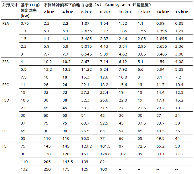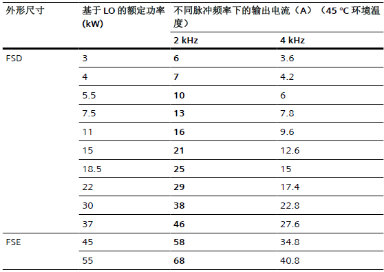 额定输出电流(加粗表示)指默认脉冲频率及 45 °C 环境温度下的电流值。