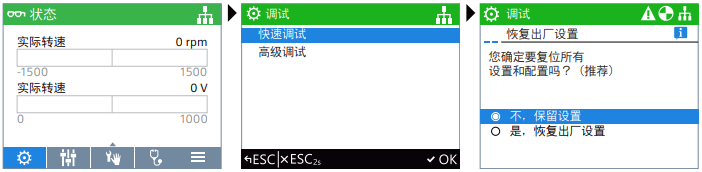 在“状态”显示界面选择“调试”功能(即齿轮状界面),进入后选择“快速调试”。下一步进入“恢复出厂设置”画面,如若重新更换宏功能则需要选择“是”。