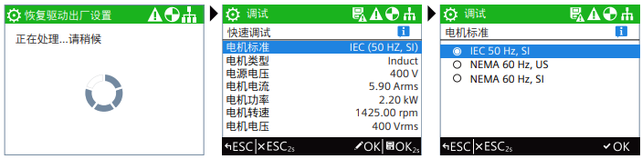 恢复出厂后在“电机标准”中根据实际情况选择电源频率和单位。