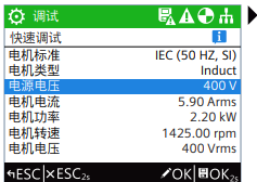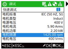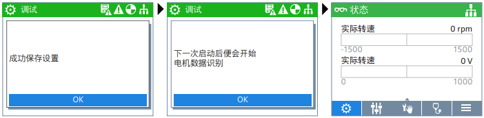 设置完成后长按OK键两秒以上进行保存,保存成功后会有下一次启动进行电机识别提示,此刻即完成使用IOP-2面板进行快速调试步骤。