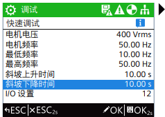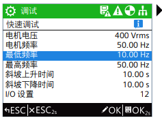 在快速调试中可以设置一些基础使用参数如:最低频率/最高频率/斜坡上升时间/斜坡下降时间,最后可以通过“I/O设置”选择预设值宏功能,方便用户根据不同需求快速设置参数,节约时间。