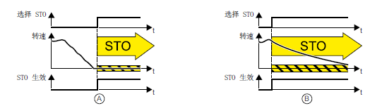 (B):如果选择 STO 功能后电机仍在旋转 (B),则电机会惯性停车直至静止。