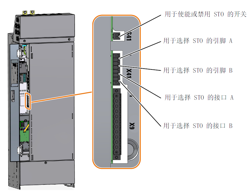 1. 将用于选择 STO 功能的电缆连接到端子 X41:STO_A 和 X41:STO_B 上。
