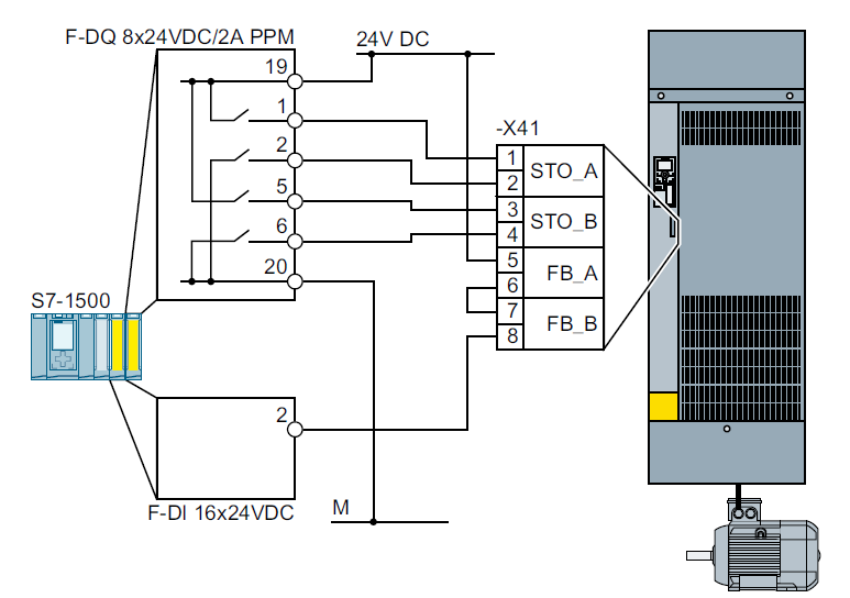 2. 将用于 STO 反馈的电缆连接到端子 X41:FB_A 和 X41:FB_B 上。