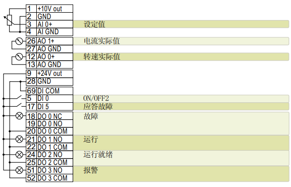 在宏41中默认以DI0为启动/停止信号;DI5为应答故障信号;DO0为故障信号;DO1为运行信号;DO2为运行就绪信号;DO3为报警信号。