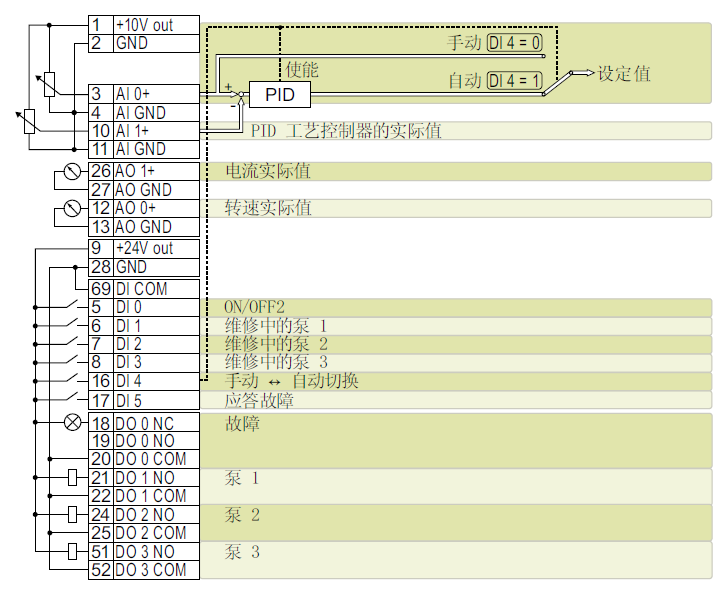 DI1为泵1维修开关;DI2为泵2维修开关;DI3为泵3维修开关;DI5为应答故障