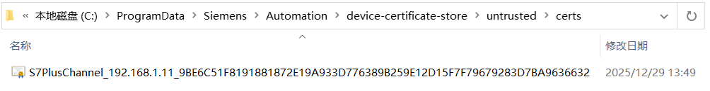 此时,打开路径“C:\ProgramData\Siemens\Automation\device-certificate-store\untrusted\certs”,可以看到有未被信任的证书产生,如图27所示: