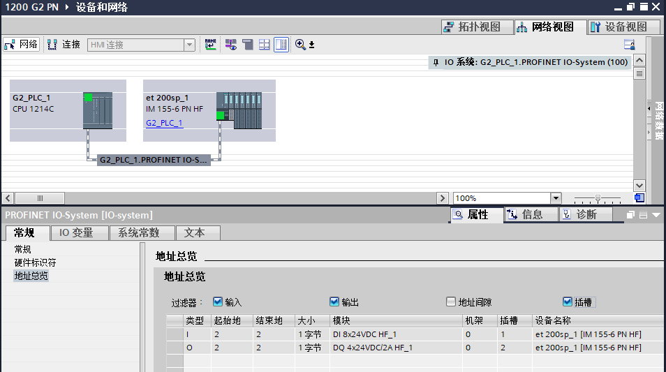 (8)在 IM155-6PN HF 的地址总览中可以看到 IM155-6PN HF 所占用的 S7-1200 G2 CPU I/O 区域,以及网络结构,如图8所示。