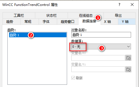 3. 在“数据连接”选项卡中选择“趋势1”的数据源的下拉列表中选择“0-无”: