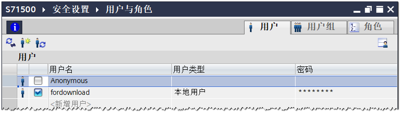 打开Portal的“用户管与角色”编辑器,取消“Annymous”,创建一个用于上传下载PLC程序的用户(此处是fordownload),并分配“PLC管理员”角色,如图26所示。