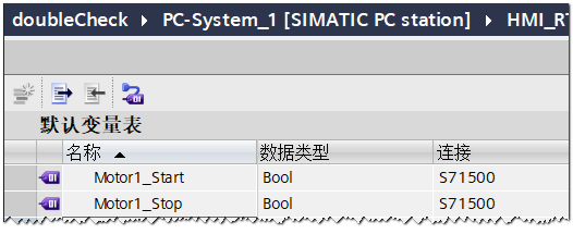 在WinCC Professional项目中存在两个变量“Motor1_Start”和“Motor1_Stop”,分别用于电机的启动和停止,如图1所示: