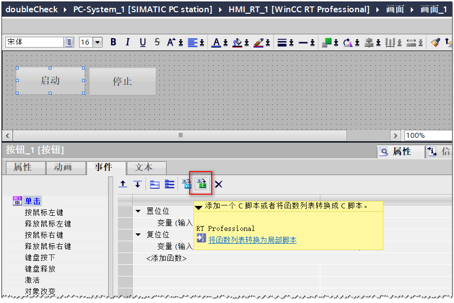 首先把启动按钮的函数列表转换成C脚本。点击事件菜单上的C脚本即可把函数列表转成C脚本,如图4所示: