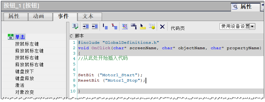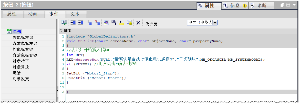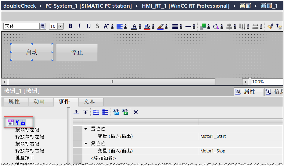 有些重要的操作,需要进行二次操作。接下来以上面启停电机的操作为例来介绍在WinCC Professional中如何实现操作的二次确认。