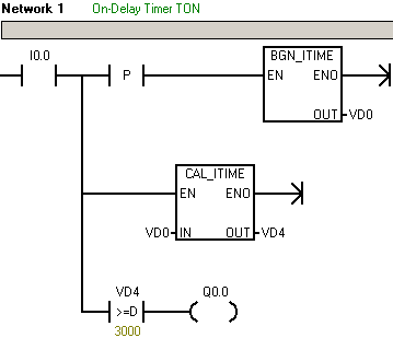 输入点 I0.0 接通(上升沿) 3 秒后(3000 ms), 输出点 Q0.0 置位。
