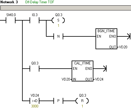 输入点 I0.3 断开(下降沿) 3 秒 (3000 ms) 后,输出点 Q0.3 复位。